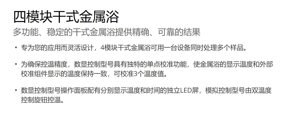 多功能干式金屬浴非常適用于具有溫度穩(wěn)定性需求的應(yīng)用。主機可放置4個模塊,共有40多款模塊供選擇,無需工具即可實現(xiàn)更換。試管和孔槽緊密接觸,極大限度提高保暖、加熱效率。數(shù)顯型號具有出色的溫度一致性、穩(wěn)定性及結(jié)果可重復(fù)性。模擬型號則是經(jīng)濟的選擇。