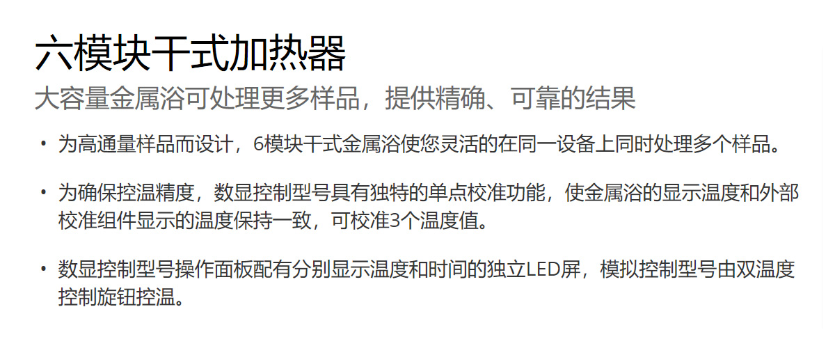 多功能干式金屬浴非常適用于具有溫度穩(wěn)定性需求的應(yīng)用。主機(jī)可放置6個(gè)模塊,共有40多款模塊供選擇,無(wú)需工具即可實(shí)現(xiàn)更換。試管和孔槽緊密接觸,極大限度提高保暖、加熱效率。數(shù)顯型號(hào)具有出色的溫度一致性、穩(wěn)定性及結(jié)果可重復(fù)性。模擬型號(hào)則是經(jīng)濟(jì)的選擇。
