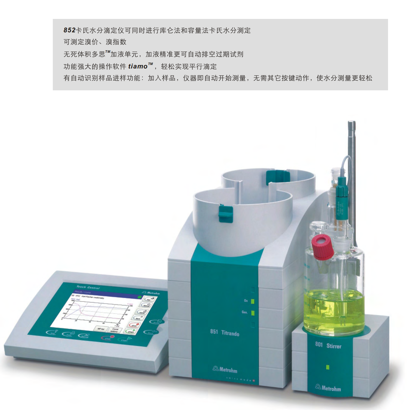852型庫侖法卡氏水分滴定儀集成了多項瑞士萬通的多項技術(shù),是庫侖法卡氏水分滴定儀的代表作。基于無死體積滴定管和多項智能化技術(shù),是高度自動化、智能化實驗室的明智之選。852兼具庫侖法/容量法兩種卡氏水分滴定方法。當(dāng)您要分析含水量范圍很寬的樣品時,其水分測定范圍從微克到100%。采用tiamoTM軟件控制,可以同時進行兩種測定。?