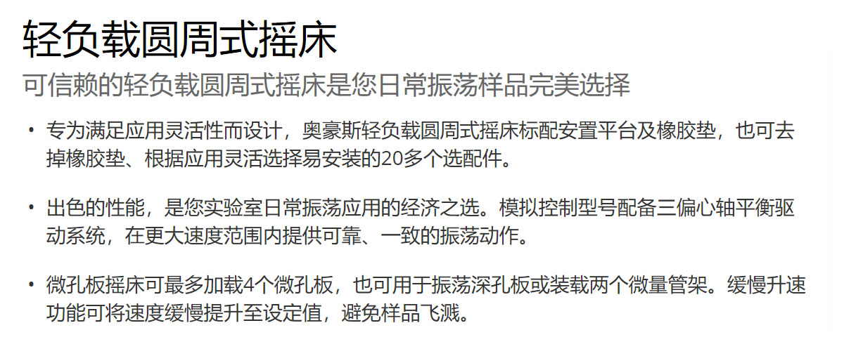 可靠耐用的奧豪斯輕負(fù)載搖床,樣品處理量高達(dá)3.6kg,根據(jù)圓周直徑和速度范圍選型,使您的樣品混合效果進(jìn)一步優(yōu)化。數(shù)顯控制輕負(fù)載搖床專門用于振蕩微孔板,兩種振幅型號可選;模擬控制型號則為經(jīng)濟(jì)之選,滿足日常應(yīng)用。所有型號配備三偏心軸平衡驅(qū)動系統(tǒng),微處理控制器確保振蕩動作可靠、一致。