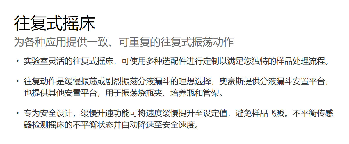 奧豪斯往復(fù)式搖床專為需要結(jié)果準(zhǔn)確、重現(xiàn)性好的各種應(yīng)用而設(shè)計,包括細(xì)胞培養(yǎng)和提取等,振蕩動作一致、均勻。振蕩動作行程長度19mm,永久潤滑的滾珠軸承及無需維護(hù)的無刷直流電機(jī)確保運(yùn)行可靠、且連續(xù)工作。